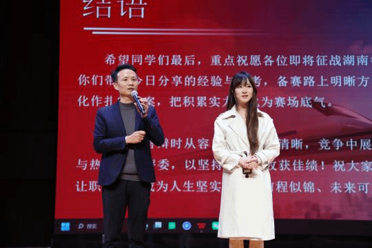 随后,2024年省大学生职业规划大赛获奖者徐欢同学分享了她的参赛经验与心路历程。她以亲历者的视角,倾情讲述了从备赛挑战到赛场收获的全过程,并分享了规划书撰写、现场展示等方面的实用技巧。尤为引人注目的是,徐欢同学正是在陈勇处长的悉心指导下取得佳绩,这一“名师出高徒”的成功范例,生动展现了从理论指导到实践成功的完整路径,极大地增强了同学们的信心。作为身边可感可学的榜样,她的成长故事深深感染了在场的每一位学子。