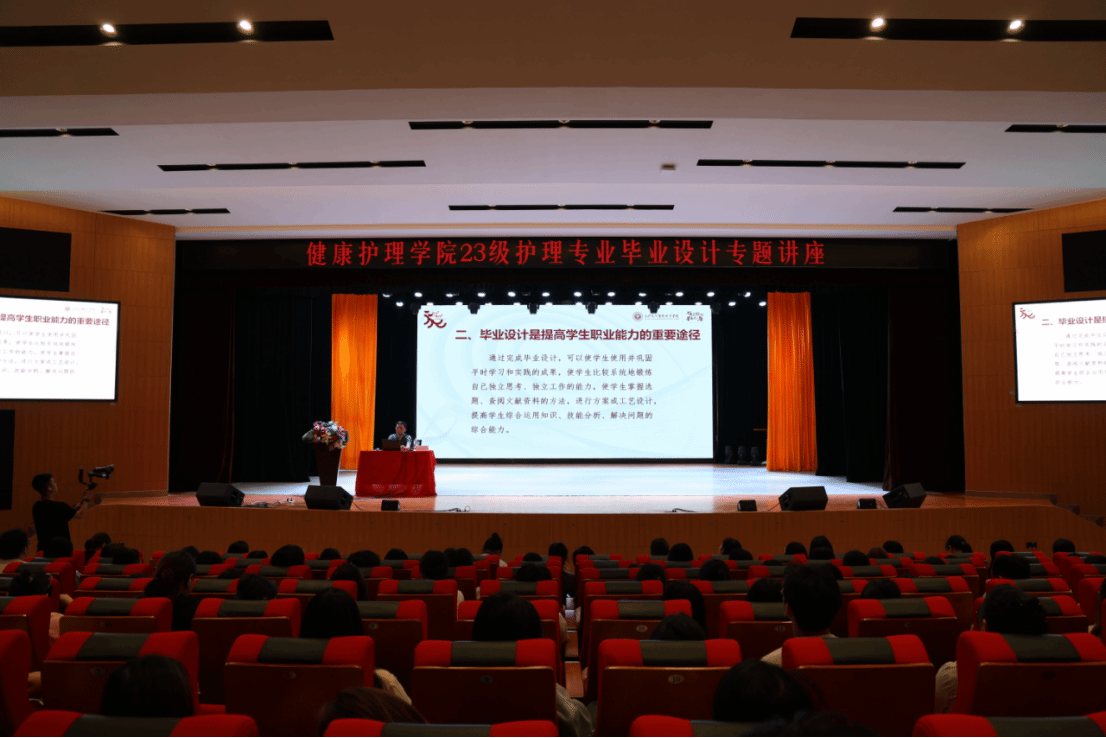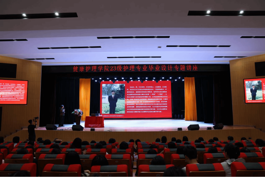 讲座伊始,健康护理学院院长陈炼红代表学院致辞,强调毕业设计是护理专业学生从理论学习向临床实践转化的重要环节,要求全体学生以严谨态度对待毕业设计选题、资料收集与毕业答辩,为顺利毕业及就业奠定坚实基础。