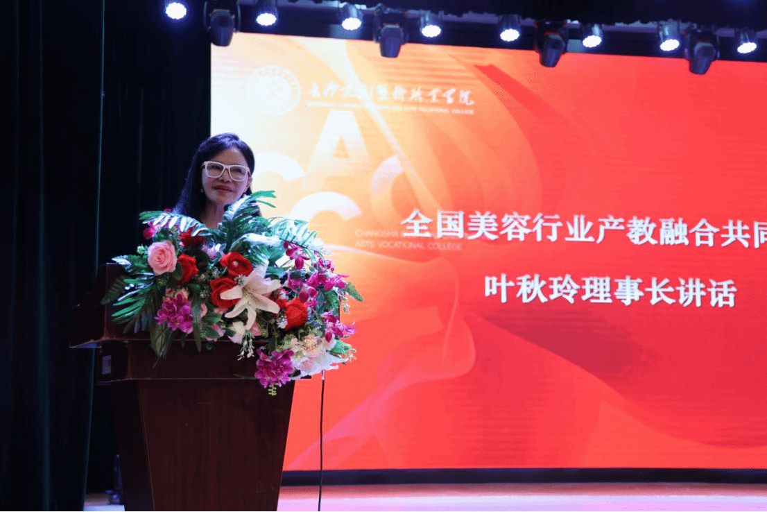 全国美容行业产教融合共同体理事长、惠州雅姬乐化妆品有限公司董事长叶秋玲女士随后发表讲话,系统介绍了共同体的发展愿景、运行机制和在美容行业人才标准建设方面的探索成果,并高度评价我校在专业建设、实践教学等方面的办学特色。