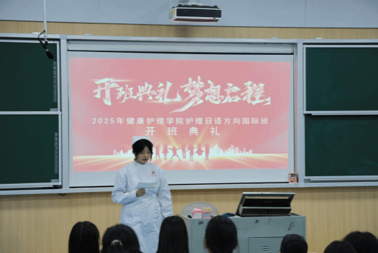 学校副校长刘杰首先代表学校致辞。她对日语护理国际班的成功开设表示热烈祝贺,并指出,此举是学校推动职业教育国际化、服务学生高质量就业的战略性举措。她强调:“学校将全力支持该合作项目,希望同学们能牢牢把握这一宝贵机遇,既精进护理专业技能,也熟练掌握日语,努力将自己锻造为符合国际标准的复合型护理人才,学校将是你们扬帆远航最坚实的后盾。”。最后她对国际班全体学员提出三点要求,第一、有目标有追求,把目光看远,去往更高的平台,得到更多的机会收获更多的回报;第二、有恒心有毅力,学好一门语言需要刻苦勤奋学习;第三、有信心要坚持。